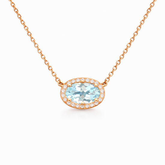 Elevate your elegance with this exquisite 18K rose gold necklace featuring a stunning 8x7mm aquamarine gemstone surrounded by a brilliant diamond halo.