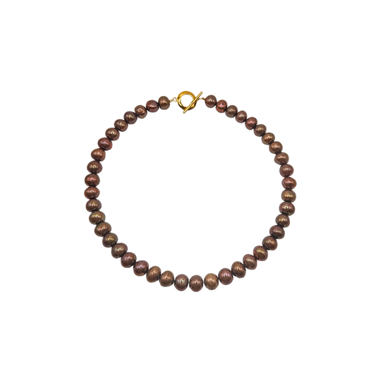 This strand of South Sea pearls has a warm chocolate tone that’s rich without being too dark. The pearls range from 9–11 mm and have a soft button shape, giving the necklace a smooth, gently rounded look that sits comfortably against the skin.