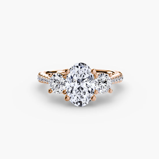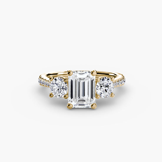 This elegant three-stone ring symbolizes your past, present, and future, elevated with a pavé band for extra sparkle and detail. A perfect union of meaning and brilliance.