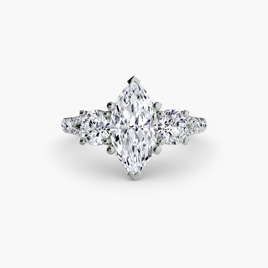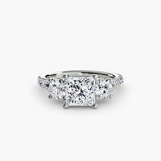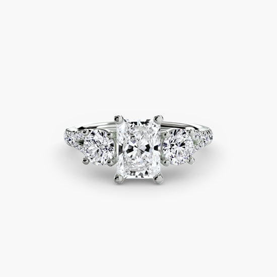 This elegant three-stone ring is beautifully elevated by a pavé-set band, adding extra sparkle and refined detail. Thoughtfully designed, it represents a perfect union of meaning and brilliance, creating a timeless piece that feels both romantic and radiant.